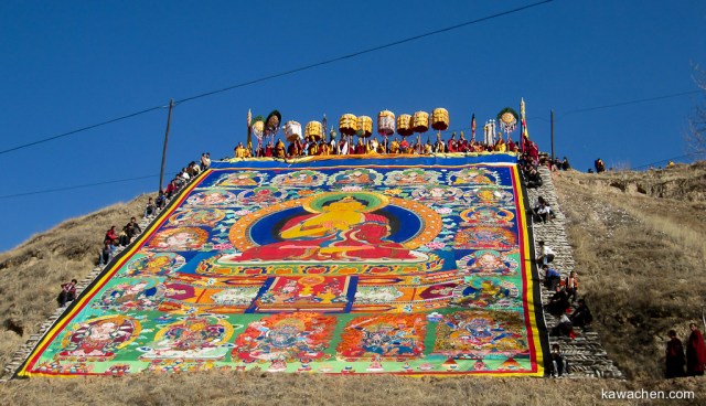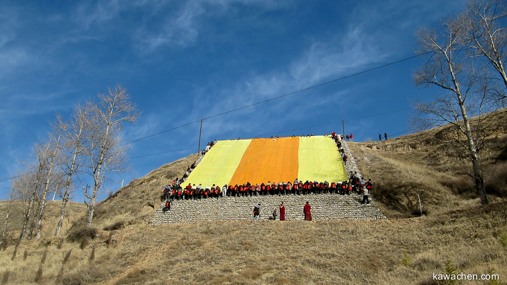 После чаепития в монастыре мы отправимся на церемонию открытия гигантской тханки на склоне горы. Эта церемония проходит всего лишь один раз в год. Из монастыря Сенгещунг достают свернутую тханку Будды и несут ее на вершину небольшой горы. Так как тханка очень большая — около 40 метров высотой и 20 метров шириной — десятки мужчин собираются вместе, чтобы поднять ее на вершину горы. Затем тханку постепенно развешивают на склоне. Весь процесс сопровождается церемониями, которые проводит местный лама в сопровождении монахов. Они распевают молитвы, воскуривают благовония и дают благословения всем участникам церемонии.