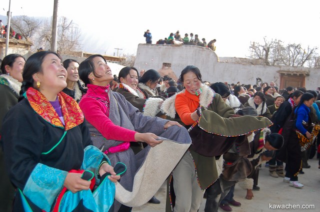 После того, как всю тханку развесят на склоне горы, люди начинают делать перед ней простирания и возносить свои молитвы. Они благодарят ушедший год и молятся, чтобы в новом году всем сопутствовала удача и счастье.