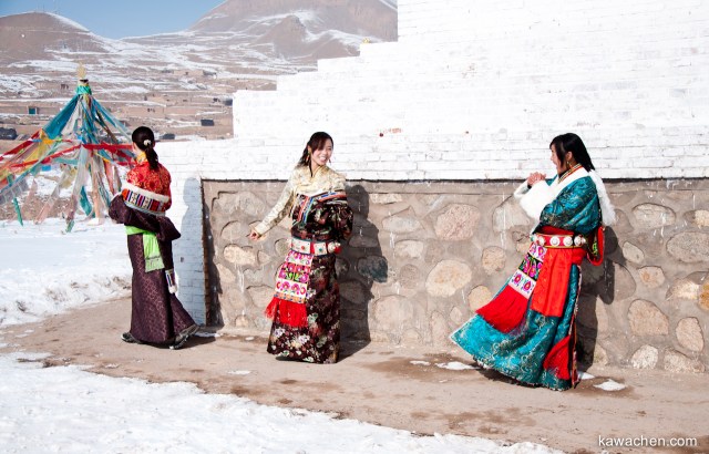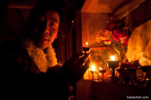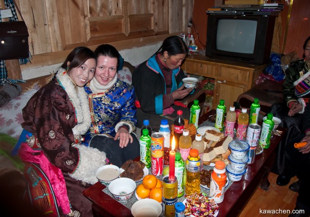 Будильник прозвенел в полночь — время вставать, но было очень холодно, шел снегопад и хотелось спать. В то же время было так интересно поучаствовать во всем происходящем, что я быстро выскочила из теплой постели, умылась и одела свое цари (тибетская зимняя одежда). На западе самый пик празднования нового года — это время, когда куранты бьют полночь. Все радуются, загадывают желания, поздравляют друг друга с новым годом. Но в Тибете никто на стрелки часов не смотрит. Где-то к половине первого ночи мы все умылись, одели свои лучшие наряды и были готовы к празденству.