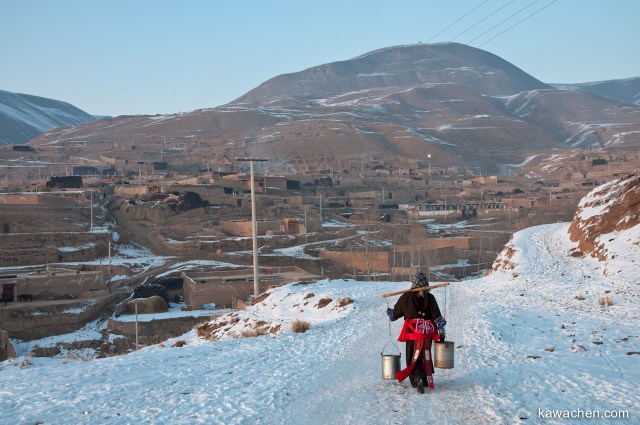 Ближе к вечеру у нас дома закончилась вода. Мы с Янгзин и детьми пошли вниз к одному из родников, чтобы набрать свежей воды. Вообще к дому Гонбо проведен кран с водой, но из-за сильных морозов труба заледенела, поэтому приходится ежедневно ходить вниз к роднику, черпать воду ковшиком, наполняя ведра. А это не так-то просто дотащить два вердра вверх по горке до дома!