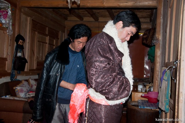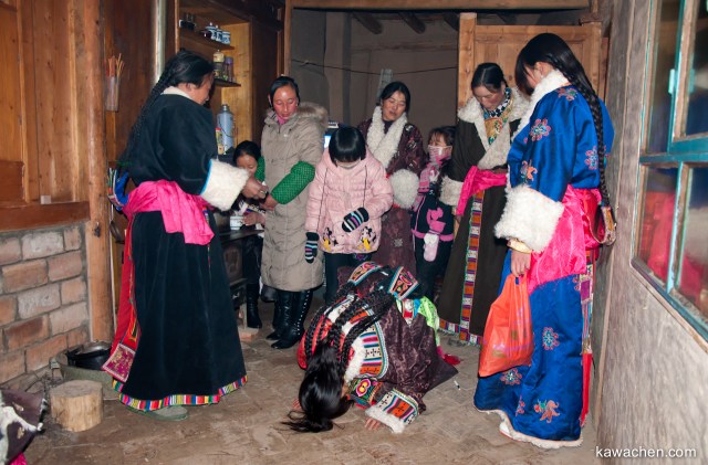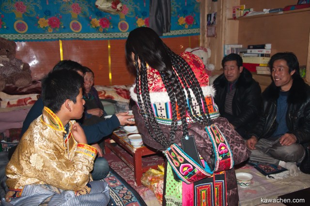 Первым делом Гонбу, брат Вангдена, вышел во двор, возжег благовония и сделал подношения духам-защитникам. Все произнесли молитвы и сделали по три простирания. После этого родители Вангдена сели по центру хиди, все мы сделали по три простирания перед ними и сели рядом. Янгзин, племянница Вангдена, разлила тибетский молочный чай. В этот день Янгзин исполнялось восемнадцать лет. Для нее этот Лосар — особенный. В эту ночь она должна была одеть специальные украшения, свидетельствующие о достижении совершеннолетия, заплести косички определенного орнамента и обойти абсолютно все дома деревни, делая простирания перед старшим поколением.