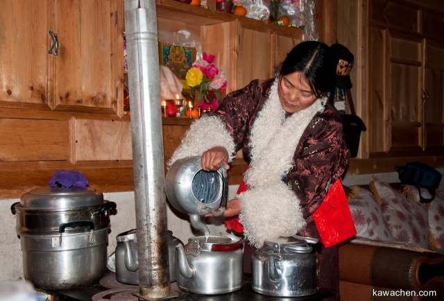 Янгзин разливает чай. Такая прическа и украшения характерны для совершеннолетних женщин Хуалунга в Амдо.